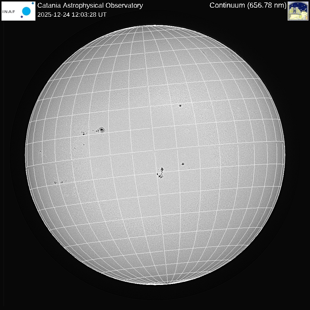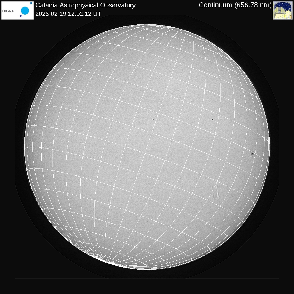 The image shows the latest continuum image of the Sun acquired at INAF - Catania Astrophysical Observatory with a quality index equal to 1 (1 =good, 3 = bad). The spacing of meridians and parallels is 10 degrees.