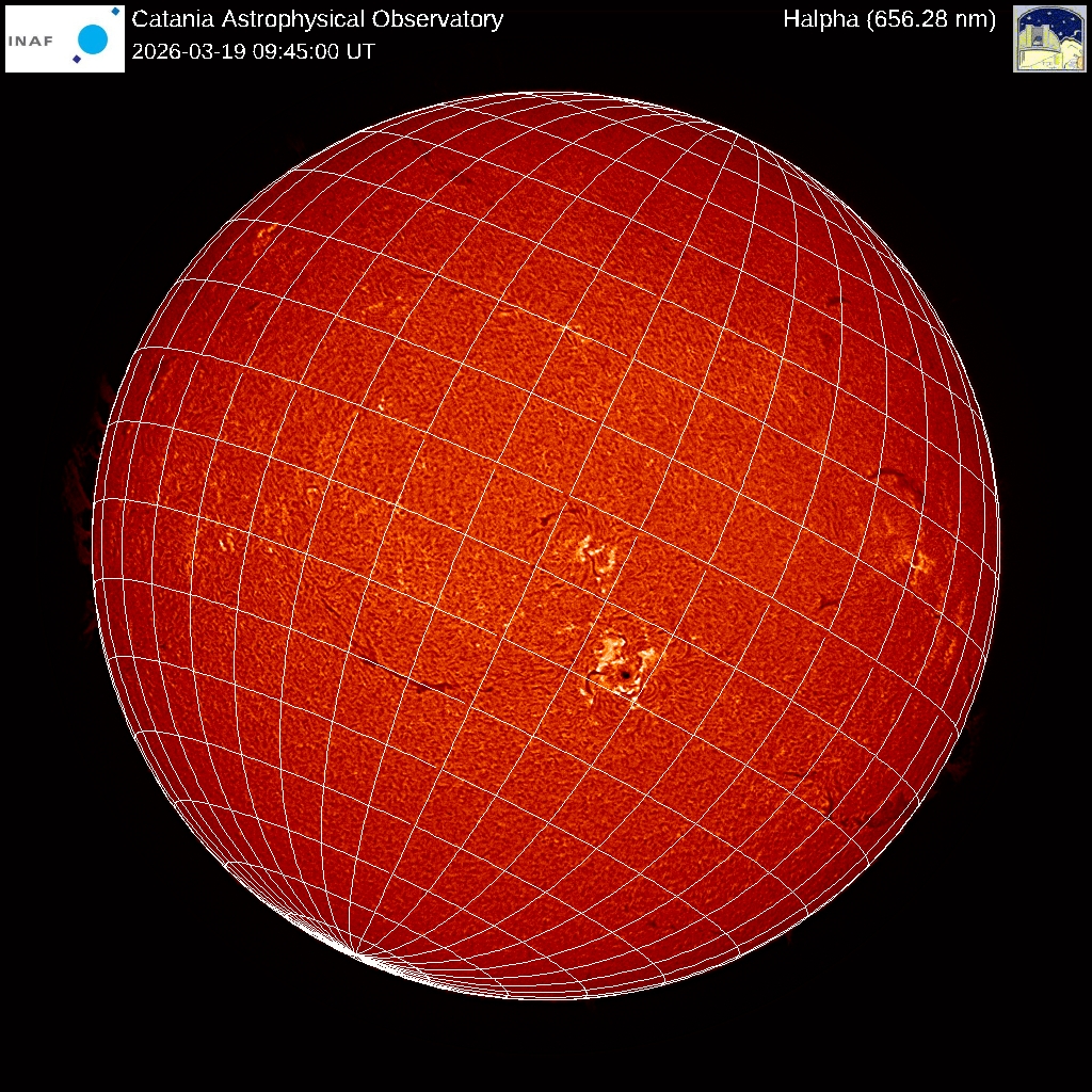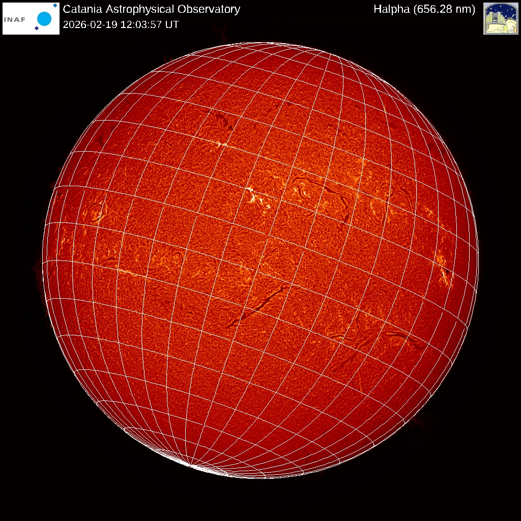 The image shows the latest Hα image of the Sun acquired at INAF - Catania Astrophysical Observatory with a quality index equal to 1 (1 =good, 3 = bad). The spacing of meridians and parallels is 10 degrees.